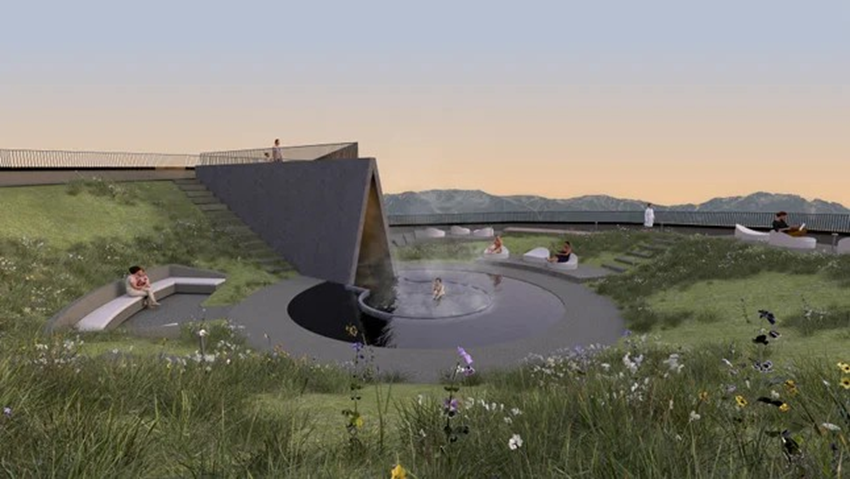 施設の最大の特徴は、蔵王のシンボル「御釜」をモチーフにした、360度を見渡せるルーフトップテラスです。遮るもののない空間からは、東に蔵王連峰の雄大な姿、西には山形ののどかな田園風景と朝日連峰の遠景が広がります。蔵王に自生する山野草が彩るテラスの中心にはジャグジーバスを備え、刻一刻と表情を変える景色を眺めながら湯浴みを楽しめます。テラスの各所には腰掛けられるスペースがあり、思い思いの場所で蔵王の自然と一体になるひとときを過ごせます。